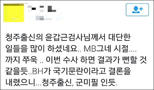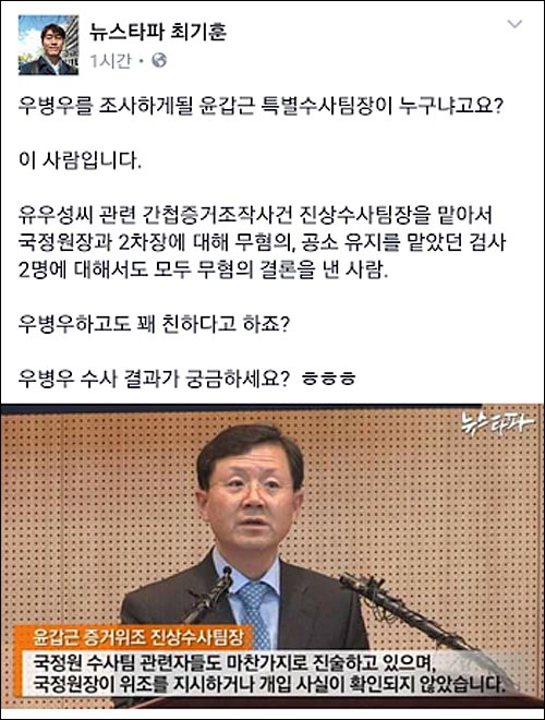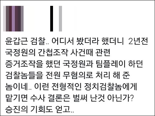 윤 고검장에 대해 최기훈 뉴스타파 기자는 페이스북에서 “유우성씨 관련 간첩증거조작사건 진상수사팀장을 맡아서 국정원장과 2차장에 대해 무혐의, 공소 유지를 맡았던 검사 2명에 대해서도 모두 무혐의 결론을 낸 사람”이라고 설명했다.