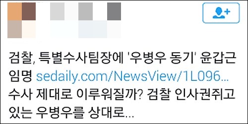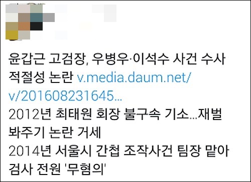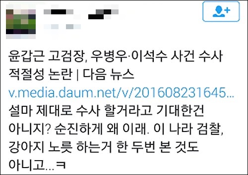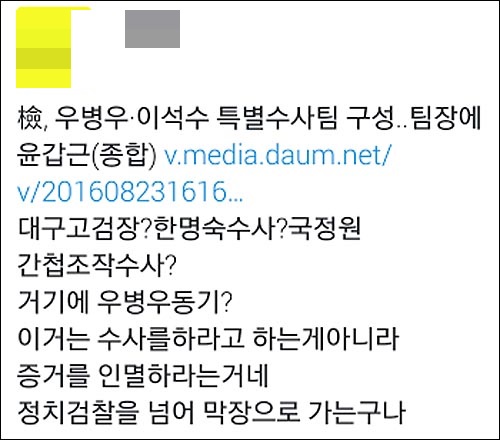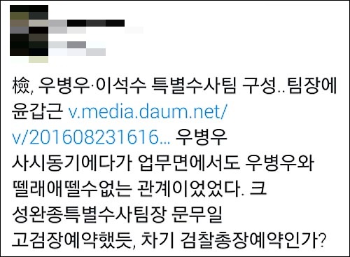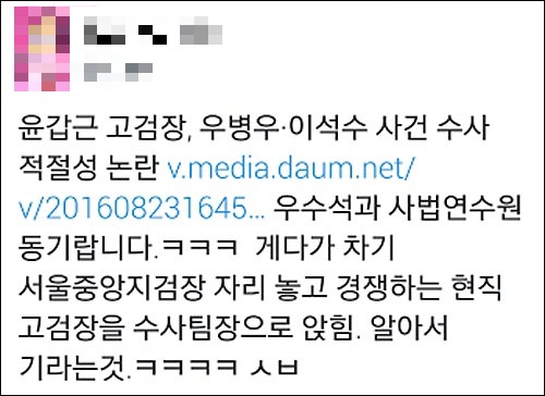 이어 최 기자는 “우병우하고도 꽤 친하다고 하죠? 우병우 수사 결과가 궁금하세요? ㅎㅎㅎ”라며 결과가 뻔하다는 반응을 보였다.