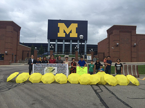 “ 미시간을 상징하는 미시간대학 스타디움 앞에서 노란 우산 프로젝트 촬영을 마쳤습니다. 노란 우산 프로젝트는 지난 6월, 세월호의 단원고 학생 희생자들의 수학여행지였던 제주도에서 시작해, 세월호 출발지인 인천 등지에서 계속되고 있는 세월호 기억 행사입니다. (미시간 세사모, 김영신)”