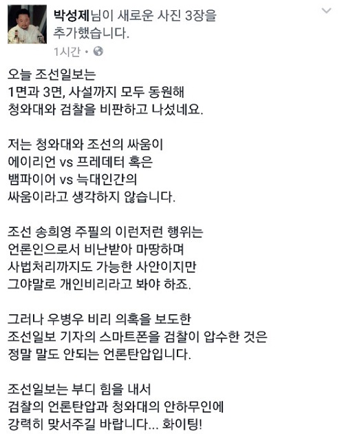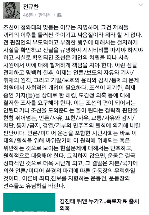 그런가하면 박성제 MBC해직기자는 “조선 송희영 주필의 이런저런 행위는 언론인으로서 비난받아 마땅하며 사법처리까지도 가능한 사안이지만 그야말로 개인비리라고 봐야 한다”며 “그러나 우병우 비리 의혹을 보도한 조선일보 기자의 스마트폰을 검찰이 압수한 것은 정말 말도 안 되는 언론탄압”이라고 비판했다.