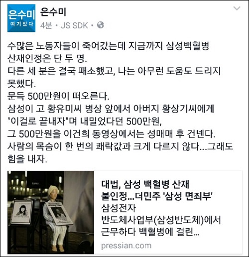 그런가하면 노동전문가인 은수미 더민주 전 의원은 자신의 SNS에 “문득 500만원이 떠오른다”며 이건희 회장 성매매 관련 의혹을 되짚었다.