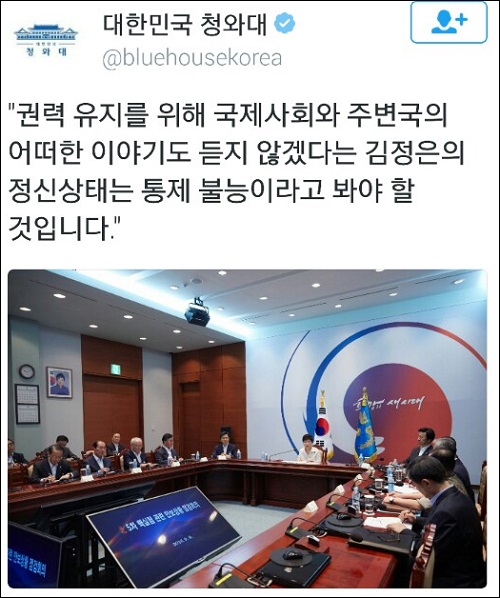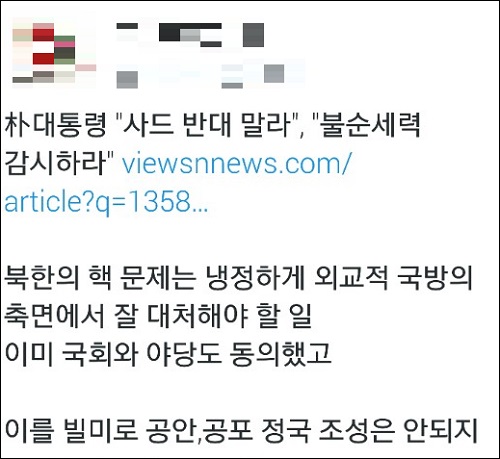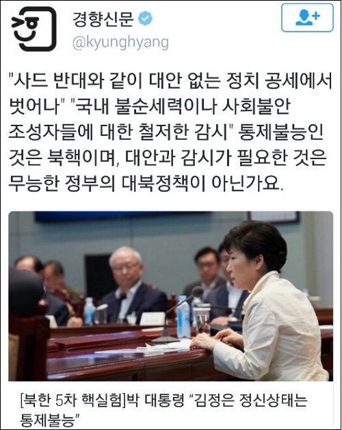 이 자리에서 박 대통령은 “김정은의 정신 상태는 통제 불능”이라고 원색 비난하며 사실상의 국가비상사태를 선언했다. 그러면서 사드 배치를 반대하는 국민을 “불순세력”으로 규정, 관계 당국에 “사회불안 조성자들에 대한 철저한 감시”를 주문하기도 했다.