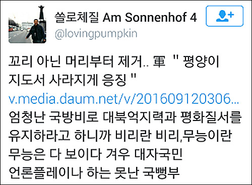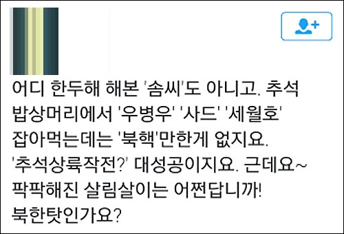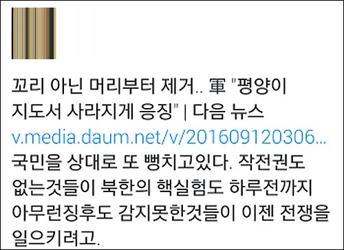 추석을 앞둔 상황과 관련 “국민들에게 추석 선물로 전쟁의 공포를 선물하고 세월호 우병우 사드... 모조리 은폐시키는 저 북풍의 주역 김정은, 박근혜정권의 둘도 없는 구세주다”, “어디 한두해 해본 ‘솜씨’도 아니고. 추석 밥상머리에서 ‘우병우’ ‘사드’ ‘세월호’ 잡아먹는 데는 ‘북핵’만한 게 없지요”, “북핵 실험의 가장 큰 수혜자는 우병우 대통령” 등의 의견도 이어졌다.