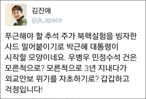 또 김 전 의원은 “푸근해야 할 추석 주가 북핵 실험을 빙자한 사드 밀어붙이기로 박근혜 대통령이 시작할 모양이네요”라며 “우병우 민정수석 건은 모른 척으로? 모른 척으로 3년 지내다가 외교안보 위기를 자초하기로? 갑갑하고 걱정”이라고 우려했다.
