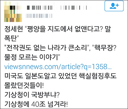 김진애 전 의원은 “전작권 포기하고, 미국의 MD체제로 편입되는 사드 도입으로 동북아 균형 포기하고, 개성공단 포기하고 중‧러 압박도 손놓고, 이제 평양을 지도상에서 없애겠다는 국방부”라며 “‘국뻥부’라는 말이 괜히 나온 게 아니다”고 꼬집었다.