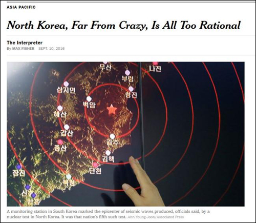 새누리당의 ‘핵무장론’처럼 주권자들을 긴장시키는 주장과는 달리 뉴욕타임스 9월 10일자(현지 시각)에는 북한 지배체제의 본질과 특성을 파악하는 데 도움이 될 수 있는 기사가 올랐다. 맥스 피셔가 쓴 기사 제목은 ‘북한, 미치기는커녕, 너무나 이성적’(North Korea, Far From Crazy, Is All Too Rational)이다. “북한은 비이성적인가? 아니면 그런 척하는 것뿐인가?”라는 문장으로 시작되는 그 기사의 요지는 이렇다. “북한이 핵실험과 미사일 발사 등 잇단 도발을 하는 배경에는 생존을 위한 이성적인 사고가 자리 잡고 있다.” 미국 서던캘리포니아대의 정치전문가 데이빗 C. 강은 “북한 지도자들이 국내외에서 하는 행동들이 혐오감을 자아내긴 해도 자국의 이익을 빈틈없이, 그리고 이성적으로 잘 추구하고 있다”며 “그런 경향이 지금도 잘 드러나고 있다”고 말했다. 정치전문가 데니 로이는 “‘미치광이 국가’나 ‘무모한 도발’ 등 북한에 붙은 꼬리표가 자국의 이익을 지키는 데 효과가 있다”고 평가했다. 그 기사는 다음과 같은 사실을 특히 강조했다. “미국이 앞장선 이라크 침공, 리비아의 ‘대령’ 무암마르 알 카다피를 제거하기 위해 나토 군대가 그 나라를 침략한 사실 때문에 북한은 미국의 침공을 두려워하고 있는 듯하다.” 그래서 북한은 미국의 침공을 피할 수 있는 수단으로 핵개발 프로그램을 선택했다는 것이다.