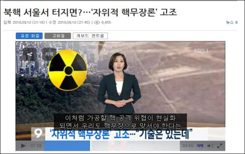 지난 10일 KBS의 <뉴스9>는 “독자적 핵무기 개발론이 힘을 얻고 있다”며 독자적 핵무장을 위해 핵확산금지조약(NPT)을 탈퇴할 필요가 있다고 강조했다. 같은 날짜 조선일보 1면 머리기사는 “‘핵 광인(狂人)’ 앞에 벌거벗은 우리의 운명”이라는 통단제목 밑에 해골이 그려진 핵탄두를 양손에 들고 말을 탄 채 돌진하는 김정은의 사진을 대문짝만하게 올렸다. 그야말로 공포심을 극대화하는 ‘작품’이었다. 9월 11일자 조선일보에 실린 기사는 제목(“군 ‘북 핵사용 징후 포착 시 평양 지도상에서 없앨 것’···김정은 잡을 레이저부대도 운영”)부터 으스스했다. ‘군 소식통’의 말을 인용한 이 기사는 “국방부가 국회에 보고한 ‘대량응징보복’ 작전개념은 지도상에서 평양의 일정 구역을 완전히 사라지게 만드는 개념으로 보면 된다”고 보도했다. “현재 우리의 탄도·순항미사일 능력으로도 상당 수준의 응징보복이 가능하다는 것을 우리 군 스스로 밝힌 것은 이번이 처음”이라고 한다. 이 말이 사실이라면 남한이 따로 핵무기를 개발할 필요가 없는 셈이다.