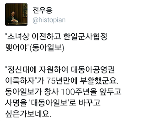 전우용 역사학자는 16일 트위터에서 ““정신대에 자원하여 대동아공영권 이룩하자”가 75년만에 부활했다”고 일제강점기 아시아·태평양 침략 논리인 대동아공영권과 동아일보의 친일행적을 되짚었다.