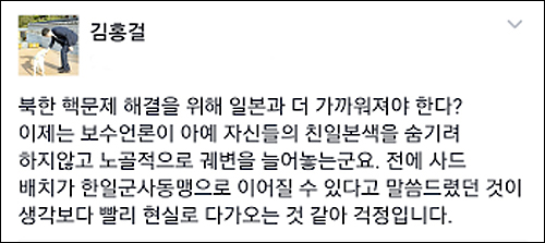 이어 김 전 위원장은 “전에 사드 배치가 한일군사동맹으로 이어질 수 있다고 말했는데 생각보다 빨리 현실로 다가오는 것 같아 걱정”이라고 우려했다.