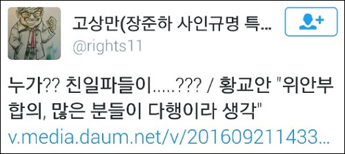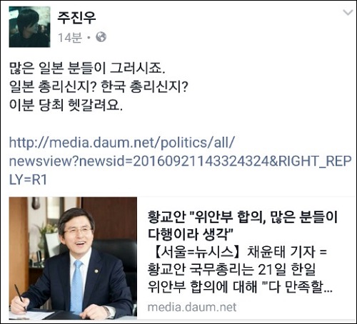 황 총리는 이날 한일 ‘위안부’ 합의 원천 무효화를 박근혜 대통령에 건의할 생각이 없는지 묻자 “(12.28합의는)일본 정부의 책임을 최초로 인정한 협의”라며 “그리고 아베 총리가 사과‧사죄하는 합의”라고 주장하기도 했다.