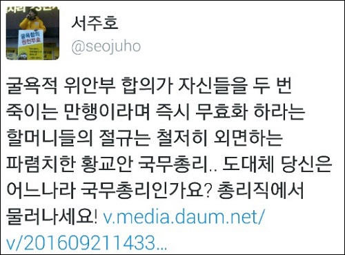 서주호 정의당 서울시당 사무처장도 “굴욕적 ‘위안부’ 합의가 자신들을 두 번 죽이는 만행이라며 즉시 무효화 하라는 할머니들의 절규는 철저히 외면하는 파렴치한 황교안 국무총리.. 도대체 당신은 어느 나라 국무총리인가요? 총리직에서 물러나세요!”라고 강하게 질타했다.