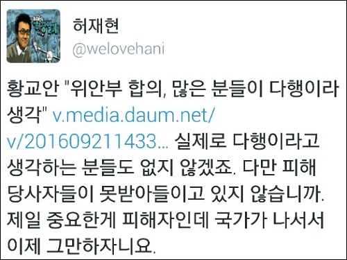 황 총리의 이 같은 발언에 <한겨레> 허재현 기자는 “실제로 다행이라고 생각하는 분들도 없지 않겠죠. 다만 피해 당사자들이 못 받아들이고 있지 않습니까. 제일 중요한 게 피해자인데 국가가 나서서 이제 그만하자니요”라고 지적했다.