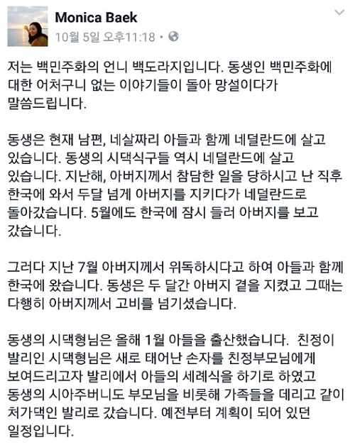 이에 대해 장녀 백도라지 씨는 “단지 아버지께서 운명하시는 순간, 발리에 동생이 머물고 있었다는 이유만으로 사실과 전혀 다른 주장을 하며 입에 담기조차 민망한 이야기를 하는 사람에게 말하겠다”며 “우리 가족은 아버지가 돌아가신 후에도 검찰과 경찰의 강제 부검 시도 때문에 단 하루도 마음 놓고 슬퍼하지도 못했다”고 밝혔다.