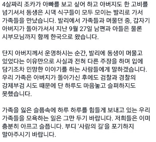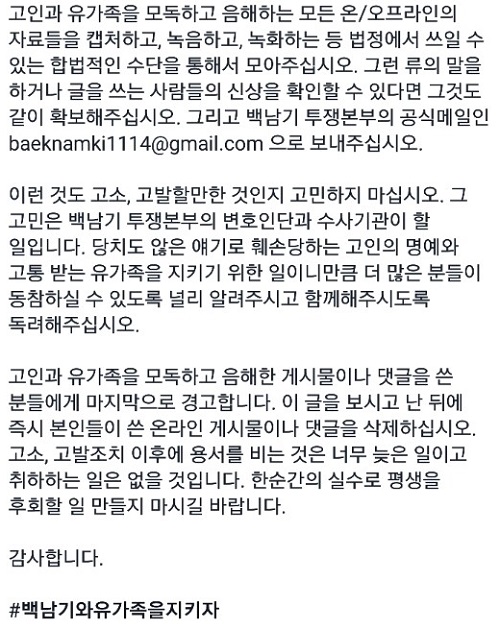 그러면서 “고인과 유가족을 모독하고 음해한 게시물이나 댓글을 쓴 분들에게 마지막으로 경고한다”며 “이 글을 보시고 난 뒤에 즉시 본인들이 쓴 온라인 게시물이나 댓글을 삭제하라”고 경고했다.