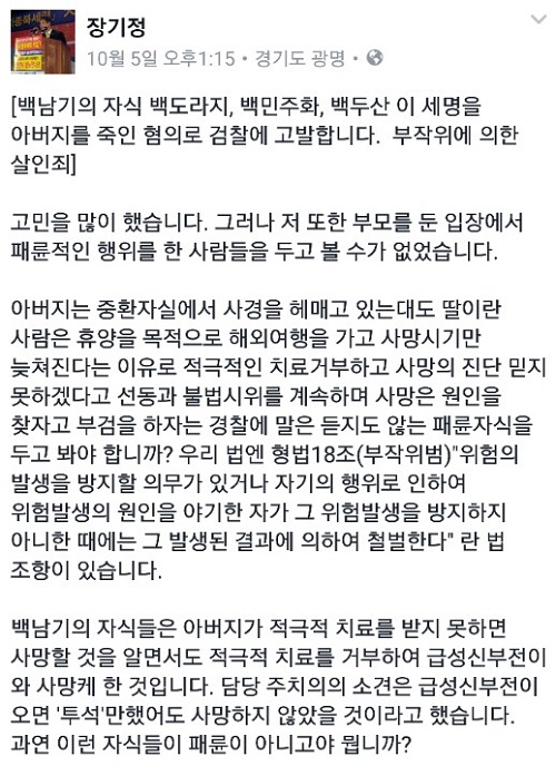 장 대표는 5일 자신의 페이스북을 통해 “백남기의 자식들은 아버지가 적극적 치료를 받지 못하면 사망할 것을 알면서도 적극적 치료를 거부하여 급성신부전이 와 사망케 한 것”이라고 주장했다.