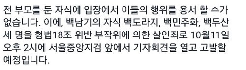 그러면서 “부모를 둔 자식에 입장에서 이들의 행위를 용서 할 수가 없다”며 “백남기의 자식 백도라지, 백민주화, 백두산 세 명을 형법 18조 위반 부작위에 의한 살인죄로 10월11일 오후 2시에 서울중앙지검 앞에서 기자회견을 열고 고발할 예정”이라고 밝혔다.