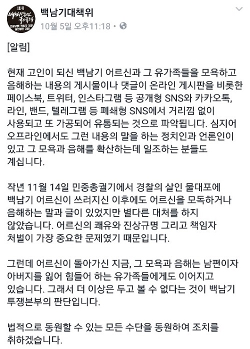 백남기 투쟁본부는 5일 “경찰의 살인 물대포에 백남기 어르신이 쓰러지신 이후에도 어르신을 모독하거나 음해하는 말과 글이 있었지만 별다른 대처를 하지 않았다”면서 이는 “어르신의 쾌유와 진상규명 그리고 책임자 처벌이 가장 중요한 문제였기 때문”이라고 설명했다.