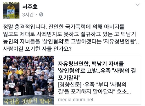 서주호 정의당 서울시당 사무처장도 “정말 충격적이다. 잔인한 국가폭력에 의해 아버지를 잃고도 제대로 사죄 받지도 못하고 절규하고 있는 고 백남기 농민의 자녀들을 ‘살인혐의’로 고발하겠다는 ‘자유청년연합’.. 사람이길 포기한 자들인가요?”라고 힐난했다.