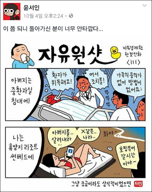 지난 4일 ‘극우성향’ 웹툰 작가 윤서인 씨는 자유경제원 한컷만화 코너에 유족을 조롱하는 듯한 만화를 그렸다.