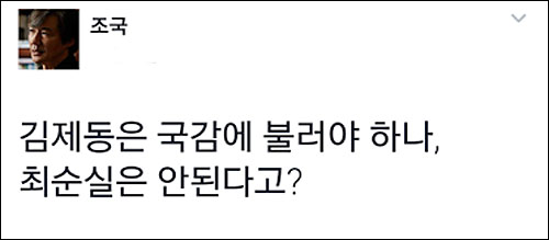 조국 서울대 법학전문대학원 교수는 “김제동은 국감에 불러야 하나, 최순실은 안된다고?”라고 꼬집었다.