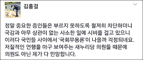 새누리당이 정권 비리 의혹으로 확대되고 있는 미르‧K스포츠재단 의혹 관련 최순실‧차은택씨의 증인 채택은 결사적으로 막으면서 연예인의 증인 출석을 추진하는 것에 대해 SNS에서는 의견이 잇따랐다.