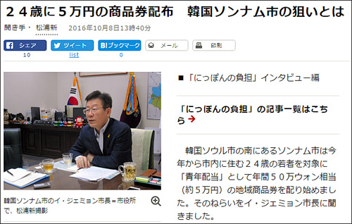韓国ソウル市の南にあるソンナム市は今年から市内に住む24歳の若者を対象に「青年配当」として年間50万ウォン相当(約5万円)の地域商品券を配り始めました。そのねらいをイ・ジェミョン市長に聞きました。