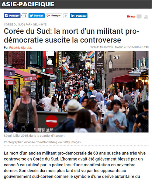 프레데릭 오자르디아스 서울 특파원은 지난 13일 ‘한국 : 논쟁이 되고 있는 한 민주진영 활동가의 죽음’이라는 제목의 기사를 통해 백남기 농민의 사망 소식과 사망원인을 ‘병사’라고 적어 촉발된 사망진단서 논란 등을 소개했다. 유엔 조사관을 인용해 기자는 백씨가 “평화적 시위대를 향해 명백한 정당성이 없이” 쏜 경찰의 물대포에 맞아 쓰러졌다고 적었다.
