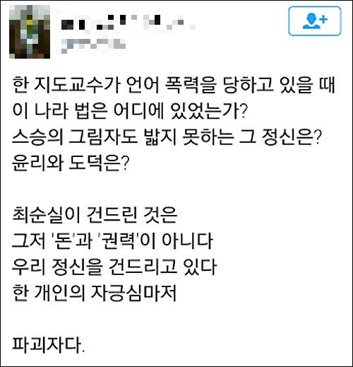 최순실씨가 자신의 딸의 지도교수에게 “교수 같지도 않은 이런 뭐 같은 게 다 있냐”고 막말을 퍼붓고 교체시켰다고 지도교수가 말했다고 TV조선이 19일 보도했다.