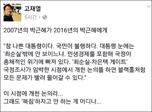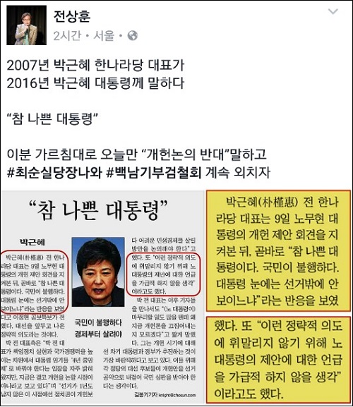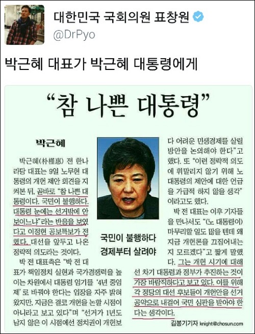 SNS상에서는 박 대통령의 “참 나쁜 대통령” 발언이 담긴 언론 보도가 공유되며, ‘2007년 박근혜 대표가 2016년 박근혜 대통령에게 전하는 말’이라는 냉소가 잇따르고 있다.
