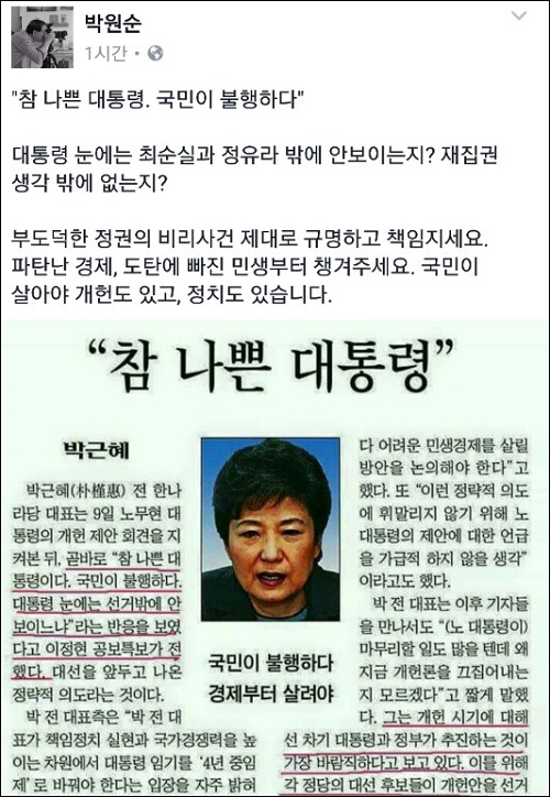 박원순 서울시장은 “참 나쁜 대통령. 국민이 불행하다”는 박 대통령 과거 발언으로 시작하는 페이스북 글을 통해 “대통령 눈에는 최순실과 정유라 밖에 안 보이는지? 재집권 생각 밖에 없는지?”라고 질타했다.