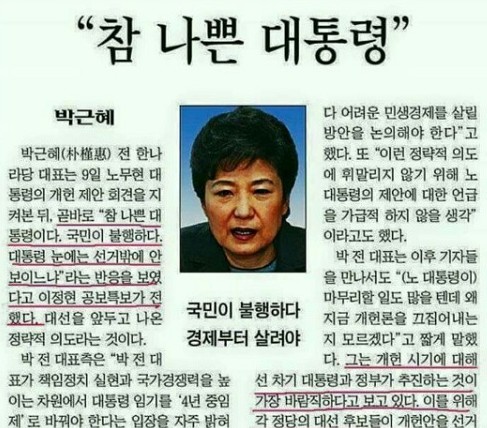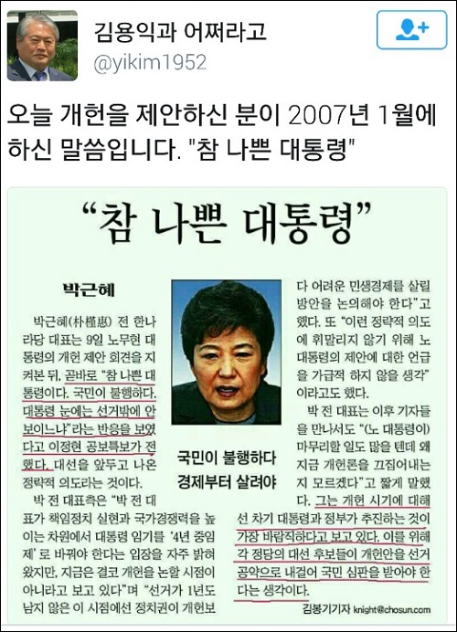 지난 2007년 한나라당 대표 시절 박근혜 대통령은 노무현 전 대통령의 ‘개헌’ 제안에 “참 나쁜 대통령”이라며 “대통령 눈에는 선거밖에 안보이냐”고 비난했었다.