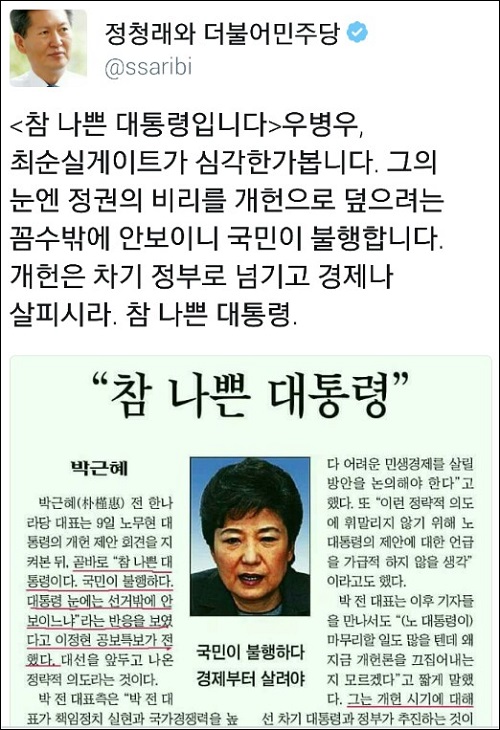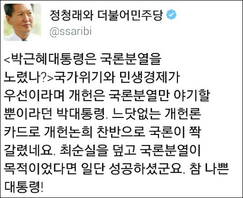 정 전 의원은 또 “국가위기와 민생경제가 우선이라며 개헌은 국론분열만 야기할 뿐이라던 박 대통령. 느닷없은 개헌카드로 개헌논의 찬반으로 국론이 쫙 갈렸다”며 “최순실 덮고 국론분열이 목적이었다면 일단 성공했다. 참 나쁜 대통령”이라고 거듭 질타했다.