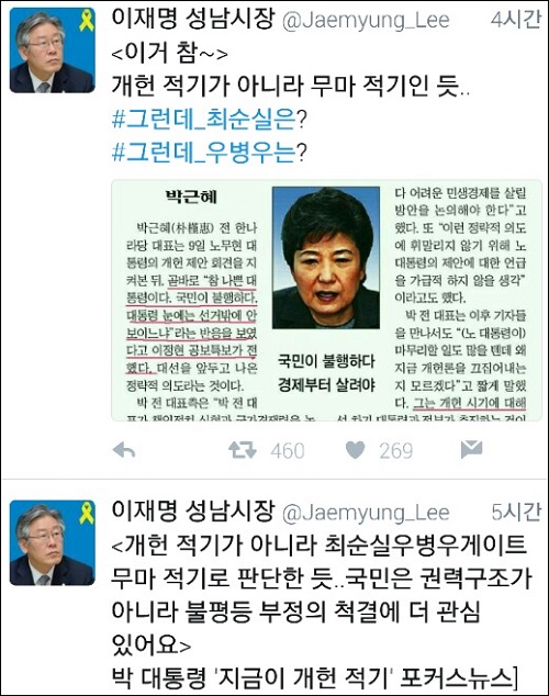 이재명 성남시장은 “개헌 적기가 아니라 최순실‧우병우게이트 무마 적기로 판단한 듯(하다)”며 “국민은 권력구조가 아니라 불평등 부정의 척결에 더 관심이 있다”고 일갈했다.