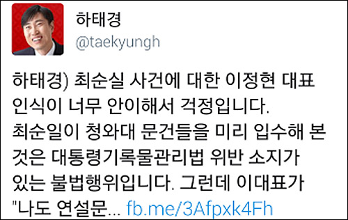 이에 대해 하태경 새누리당 의원은 SNS에서 “이정현 대표 인식이 너무 안이해서 걱정”이라며 “최순실씨가 청와대 문건들을 미리 입수해 본 것은 대통령기록물관리법 위반 소지가 있는 불법행위”라고 지적했다.