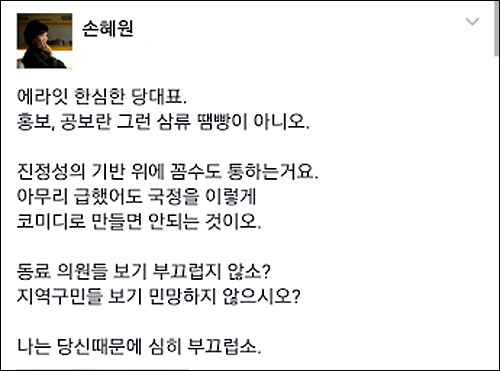 손혜원 더불어민주당 의원은 “한심한 당 대표, 홍보, 공보란 그런 삼류 땜빵이 아니오”라며 “진정성의 기반 위에 꼼수도 통하는 것”이라고 비판했다. 손 의원은 “아무리 급했어도 국정을 이렇게 코미디로 만들면 안된다”며 “동료 의원들 보기 부끄럽지 않소? 지역구민들 보기 민망하지 않으시오?”라고 질타했다.