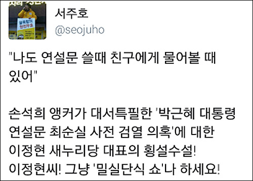 이정현 새누리당 대표가 ‘최순실 연설문’ 파문에 대해 25일 자신도 연설문을 작성하기 전에 친구 등 지인에게 물어본다는 황당한 해명을 내놔 비판이 거세게 일고 있다.