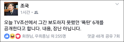 조국 서울대법학전문대학원 교수는 페이스북을 통해 “오늘 TV조선에서 그간 보도하지 못했던 ‘폭탄’ 6개를 공개한다고 한다”며 “내용, 장난 아닙니다”라고 전했다.