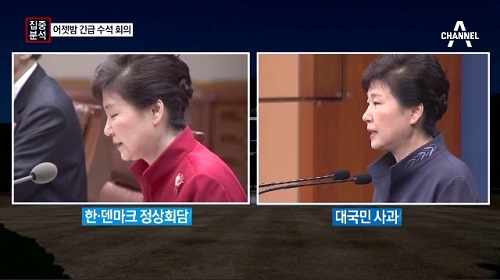 채널A의 기행은 여기서 그치지 않습니다. 국정농단으로 국가의 기강이 무너졌음을 단적으로 보여준 대통령의 ‘대국민 사과’에 자사의 단골 아이템인 ‘대통령 패션 보도’를 낸 것입니다. 채널A <‘최순실’ 이름 첫 거명>(10/25 http://bit.ly/2eQQtZi)에서 정치부 차장인 심정숙 기자는 대국민 사과 이전까지 대통령의 행적을 정확한 시간까지 언급하며 정리했습니다. 그러더니 갑자기 화면에 덴마크 정상회담에서의 대통령 옷차림과 대국민 사과 당시 옷차림을 화면에 띄우고는 “당시 모습을 비교해보면 정상회담에서는 붉은색 정장을 입었다. 이 사이에 다시 약간 침통한 분위기를 강조하기 위해 남색 바지 정장 차림으로 바뀌었”다고 설명했습니다. 심지어 앵커는 “그 짧은 시간에 옷을 갈아입고 대국민 사과를 할 수 있는 연설문, 직접 작성했겠죠?”라고 맞장구쳤고 기자는 “참모들의 건의가 있었겠지만 진솔하게 담아야한다는 의지가 있었을 것”이라 답했습니다. ‘국정농단’이 사실임이 밝혀진 시점에서, ‘사과하기 위해 옷 갈아입은 대통령’을 띄운 채널A, 시청자도 민망합니다.