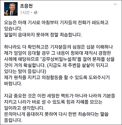 사실 여부를 밝힐 것을 요구를 받은 당사자인 조응천 더불어민주당 의원은 페이스북에서 “(기자들의 질문에) 응대하지 못하여 죄송하다”고 말했다.