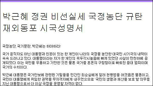 26일 (미국 현지시각) ‘박근혜 대통령의 하야를 촉구하는 장호준 외 재외동포 일동’ 명의로 <박근혜 정권 비선실세 국정농단 규탄 재외동포 시국성명서>가 발표되어 재외동포들이 서명에 돌입했다.