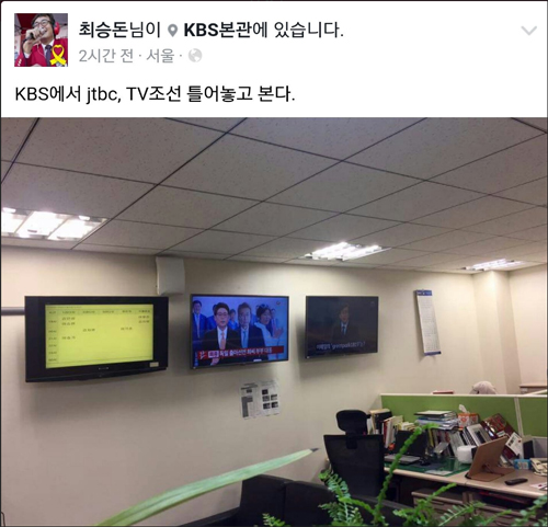 9. KBS 최승돈 아나운서가 자신의 페이스북에 JTBC와 TV조선 뉴스를 시청하고 있는 모습을 공개했습니다. 최근 JTBC와 TV조선이 '최순실 게이트'와 관련된 내용을 앞다투어 단독 보도하며 연일 화제인 가운데 보도 경쟁에서 뒤처진 공영방송 KBS의 씁쓸한 뒷모습을 보여주고 있습니다.