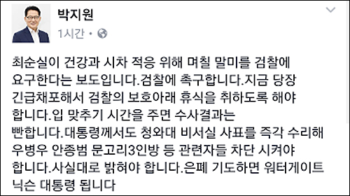 박지원 비대위원장은 페이스북에서 “지금 당장 긴급체포해서 검찰의 보호 아래 휴식을 취하도록 해야 한다”며 “입 맞추기 시간을 주면 수사결과는 뻔하다”고 비판했다.