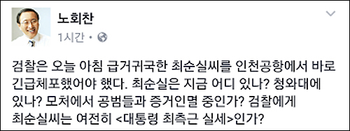 노 원내대표는 “검찰에게 최순실씨는 여전히 ‘대통령 최측근 실세’인가?”라고 검찰을 질타했다.