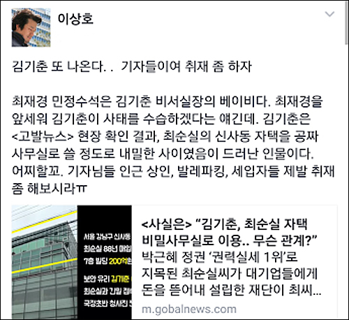 이 기자는 “김기춘은 <고발뉴스> 현장 확인 결과, 최순실의 신사동 자택을 공짜 사무실로 쓸 정도로 내밀한 사이였음이 드러난 인물”이라며 “기자님들 인근 상인, 발레파킹, 세입자들 제발 취재 좀 해보시라”라고 지적했다.