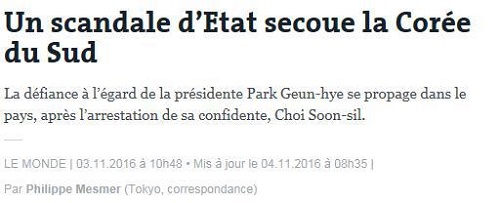 프랑스 유력 일간지 <르몽드>가 종이신문의 한 면을 할애해 ‘최순실-박근혜 게이트’로 어지러운 한국의 상황을 자세하게 보도했다. 필립 메스메르 도쿄 특파원은 11월 4일자 2면 머리기사로 “한국을 흔들고 있는 국가적 스캔들” 이라는 제목의 기사를 내고 ‘최순실-박근혜 게이트’의 진행 상황을 실었다. 그 밑에는 “빈틈없는 사업가이자 무당인 박 대통령의 친구”라는 제목으로 최순실에 대한 자세한 설명을 적었다.