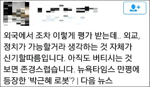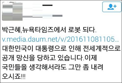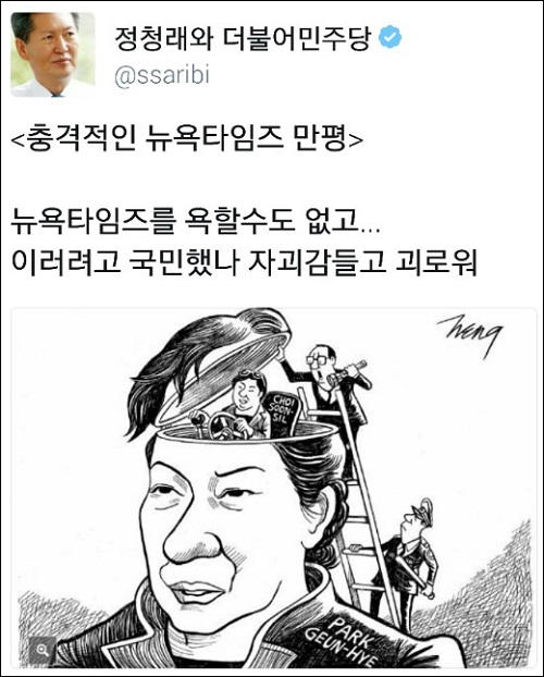 해당 만평을 접한 정청래 전 더불어민주당 의원은 트위터에 “충격적인 뉴욕타임즈 만평”이라며 “뉴욕타임즈를 욕할 수도 없고.. 이러려고 국민했나 자괴감 들고 괴로워”라며 박 대통령의 대국민담화를 빗대 꼬집었다.