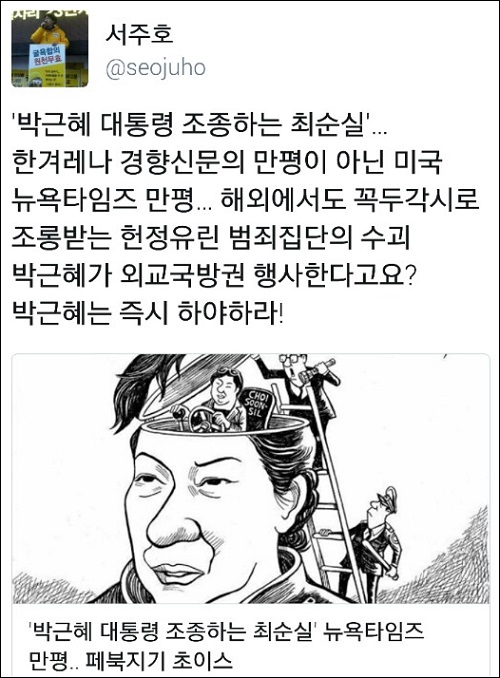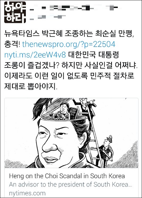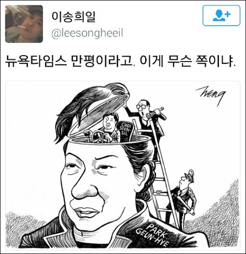 뉴욕타임즈가 ‘최순실 국정농단’ 사태와 관련해 박근혜 대통령을 조롱하는 듯한 만평을 실어 논란이 일고 있다.