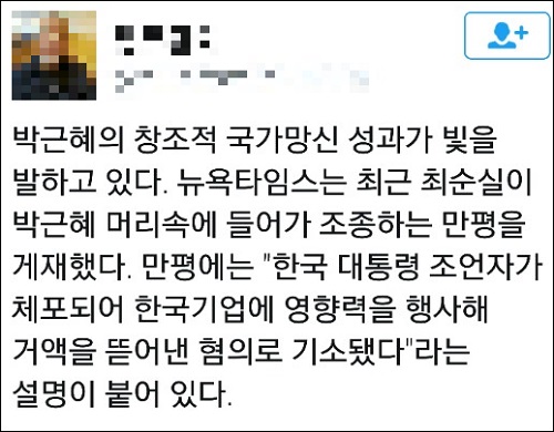 그리고 뉴욕타임즈는 만평에 “한국 대통령의 조언자가 체포되어 한국 기업에 영향력을 행사해 거액을 뜯어낸 혐의로 기소됐다”고 적었다.