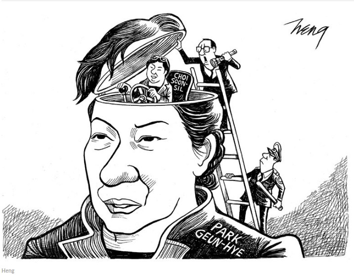 지난 6일자 만평에는 어깨에 ‘PARK GEUN-HYE’라고 적힌 큰 로봇이 등장한다. 여기에 검찰로 보이는 남성이 사다리를 타고 올라가 로봇 머리 뚜껑을 열고 손전등을 비추고 있고, 그 안에 한 여성이 ‘CHOI SOON_SIL’이라고 적힌 의자에 앉아 로봇을 조종하고 있다. 검찰로 보이는 남성 뒤에는 경찰이 뒤따르고 있는 모습이다.