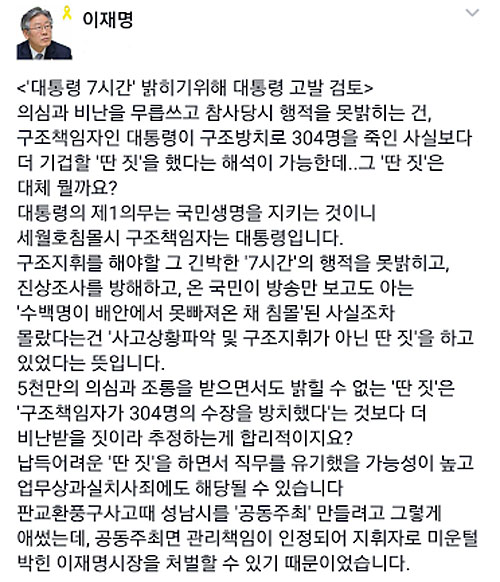이 시장은 “구조지휘를 해야 할 그 긴박한 ‘7시간’의 행적을 못 밝히고, 진상조사를 방해하고, 온 국민이 방송만 보고도 아는 ‘수백명이 배안에서 못 빠져온 채 침몰’된 사실조차 몰랐다는 건 ‘사고상황 파악 및 구조지휘가 아닌 딴 짓’을 하고 있었다는 뜻”이라고 당일 행적에 의구심을 제기했다.